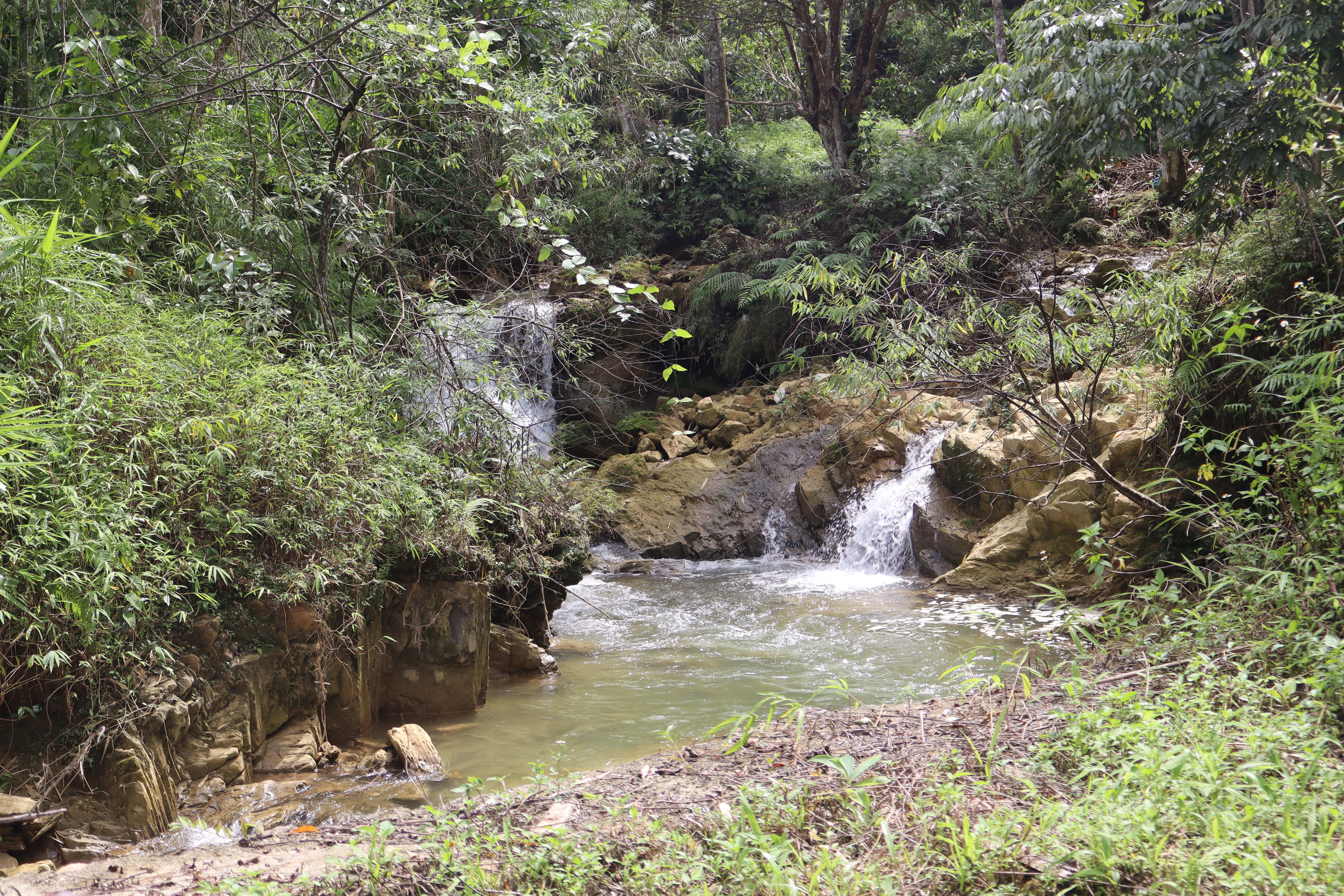 Đường dẫn vào thác có nhiều đoạn ngoằn ngoèo, dốc và đường nhỏ trong núi.